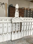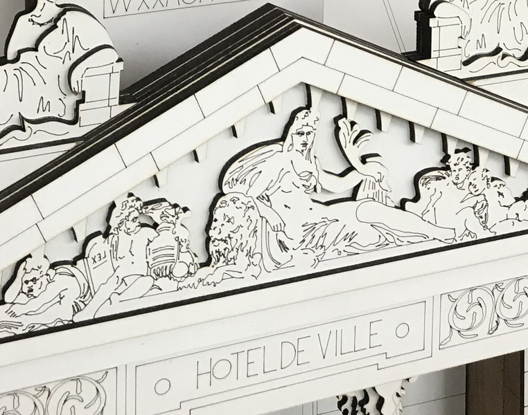 Cette maquette réalisée en découpe lazer permet grace à un système d'aimants de nomer, de coller et décoller facilement tous les éléments décoratifs de la façade de la mairie . Bossage, colonnes, balcons, frontons, médaillons etc...