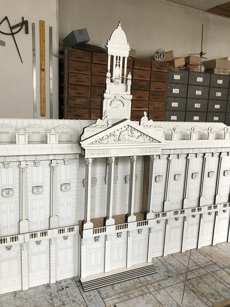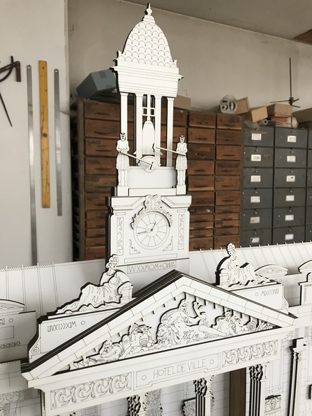 Cette maquette réalisée en découpe lazer permet grace à un système d'aimants de nomer, de coller et décoller facilement tous les éléments décoratifs de la façade de la mairie .