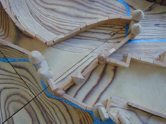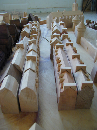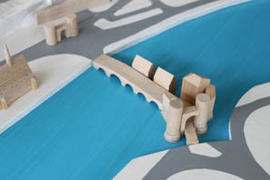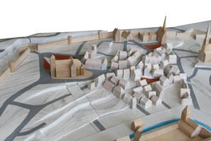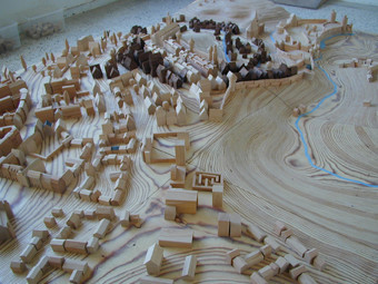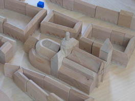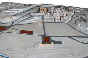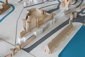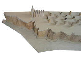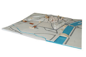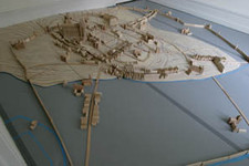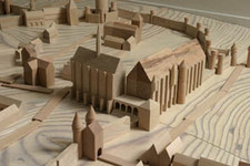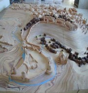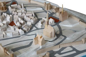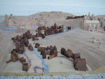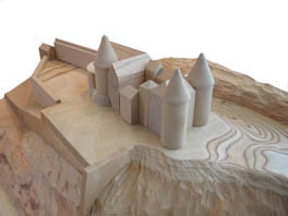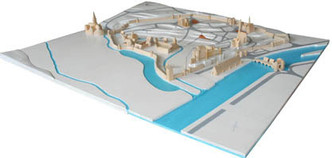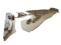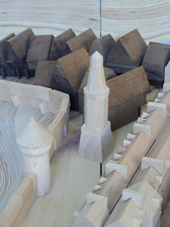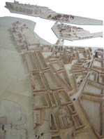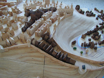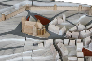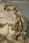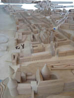 Maquette évolutive géante de la ville de Bourges (16m2) permettant de construire la ville (ou un quartier) de l'époque gallo-romaine à nos jours avec accompagnement de schémas et plans de la ville.. Des éléments escamotables représentent les édifices disparus et nous font comprendre la rémanence des monuments disparus.